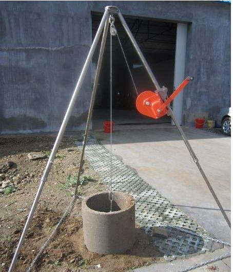 在乡下,家家户户都会有水井,基本上三个月或者五个月就需要清理一下,长时间不清理的话,灰尘或者杂物会沉到水井下面,在清理水井时就用到了救援三脚架。